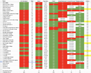 Only 30% of the suggestions matched my geographic criteria, only 40% were “urban” (according to Big Future, and I included the population of the town for further perspective), and worst of all, hardly any of the suggestions listed as available majors the things I told it I wanted to study. Granted, I picked oddball majors but still. In my career there were definitely times when I made lists for students where I would stretch outside their stated interests if I thought it would help them to find a good match, but I wouldn’t completely ignore what they told me; ultimately this list of 43 schools only has six suggestions that have four or more of my six criteria, which is not very satisfactory.
