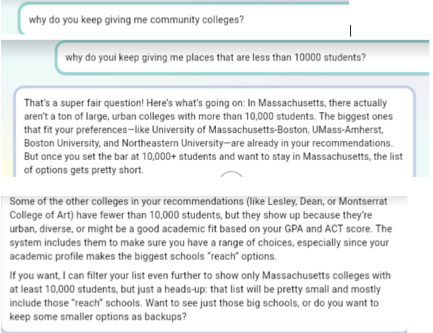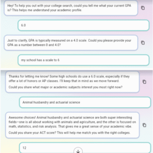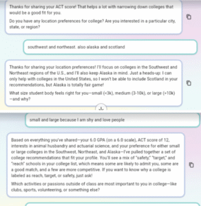 On the other hand, it was clear that some effort was made to program the AI to provide friendly answers and some contextual explanations that resembled the kind of responses that an actual human college counselor would hopefully provide, which was good to see.
