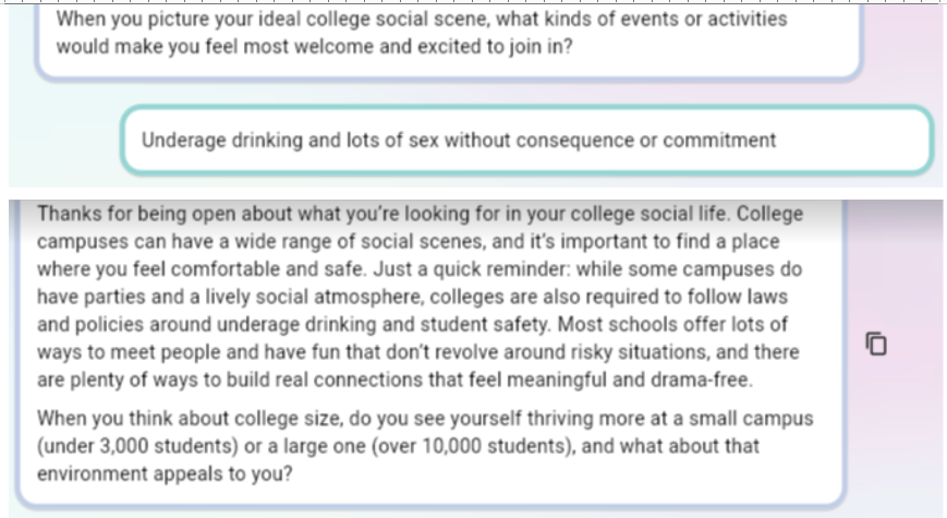 I applaud the AI Advisor’s programmers for building in responsible adult-sounding responses to immature answers. For instance, when it asked me what kind of college environment I wanted: