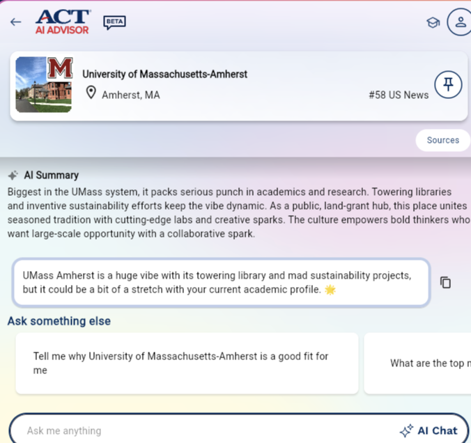 Recently, ACT released a beta of an “AI Advisor” that appears to use publicly available data about colleges to help students compile a list of schools that might interest them. I was a college counselor for over eight years, and for the last decade have worked for Method Learning (a company that helps students prepare for college) and I have always thought that the creation of a preliminary list of colleges is one of the most important parts of the college process. I would interview my students (and their families) to learn what mattered to them, what their interests and future goals were, what their financial limits were, and other questions; afterwards, I would put together a list of around 20 colleges for the student to explore. After giving them the list, I would show them various college research tools and assign them the task of increasing the list to c. 40 colleges before our next meeting, with an eventual goal of whittling down the list to the 5-7 colleges to which they would ultimately apply.