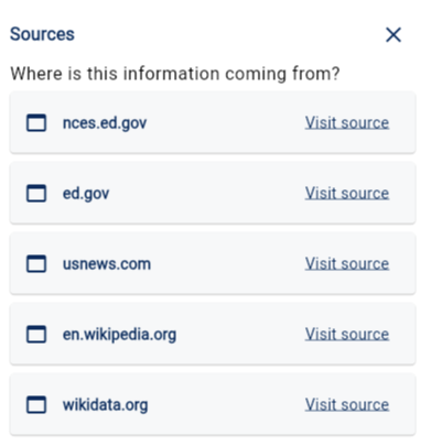 The “sources” list is hard to understand, and it doesn’t differentiate between sources nor does it attempt to tell students if one is more authoritative than the rest. And the links go to top-level pages, so there is no easy way to follow those links to get more details about UMass.