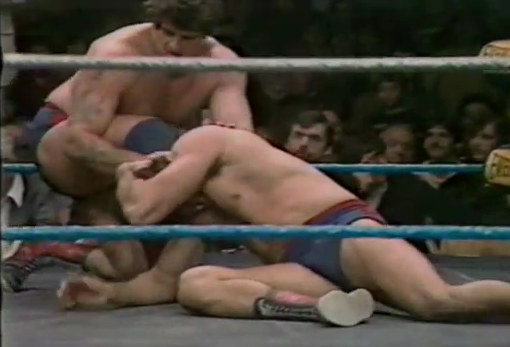 The beating of Tony Garea continues, as we are told that “it looks like Garea is hurt…he seems to be in a daze”. But he refuses to give in. Patterson muses that “Rick Martel must be frustrated…he cannot come in the ring to save Tony Garea, but once he does…I hope he does…” indicating that the announcers also support the babyfaces. At this point, as Mr. Saito is blatantly choking Garea (though the ref cannot see it), Rick Martel has had enough, and comes charging in to break the hold. But he is hoist on his own petard as the referee immediately sends him back to his corner. And of course, while this is going on, Mr. Fuji and Captain Lou both join in the torture of Tony Garea.