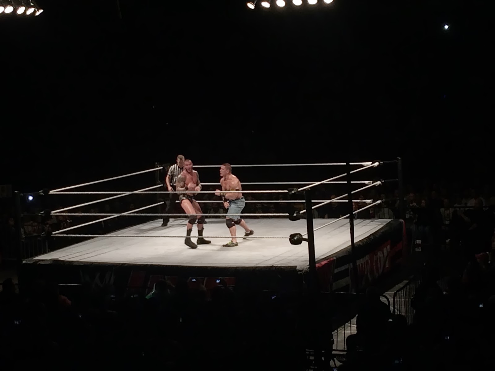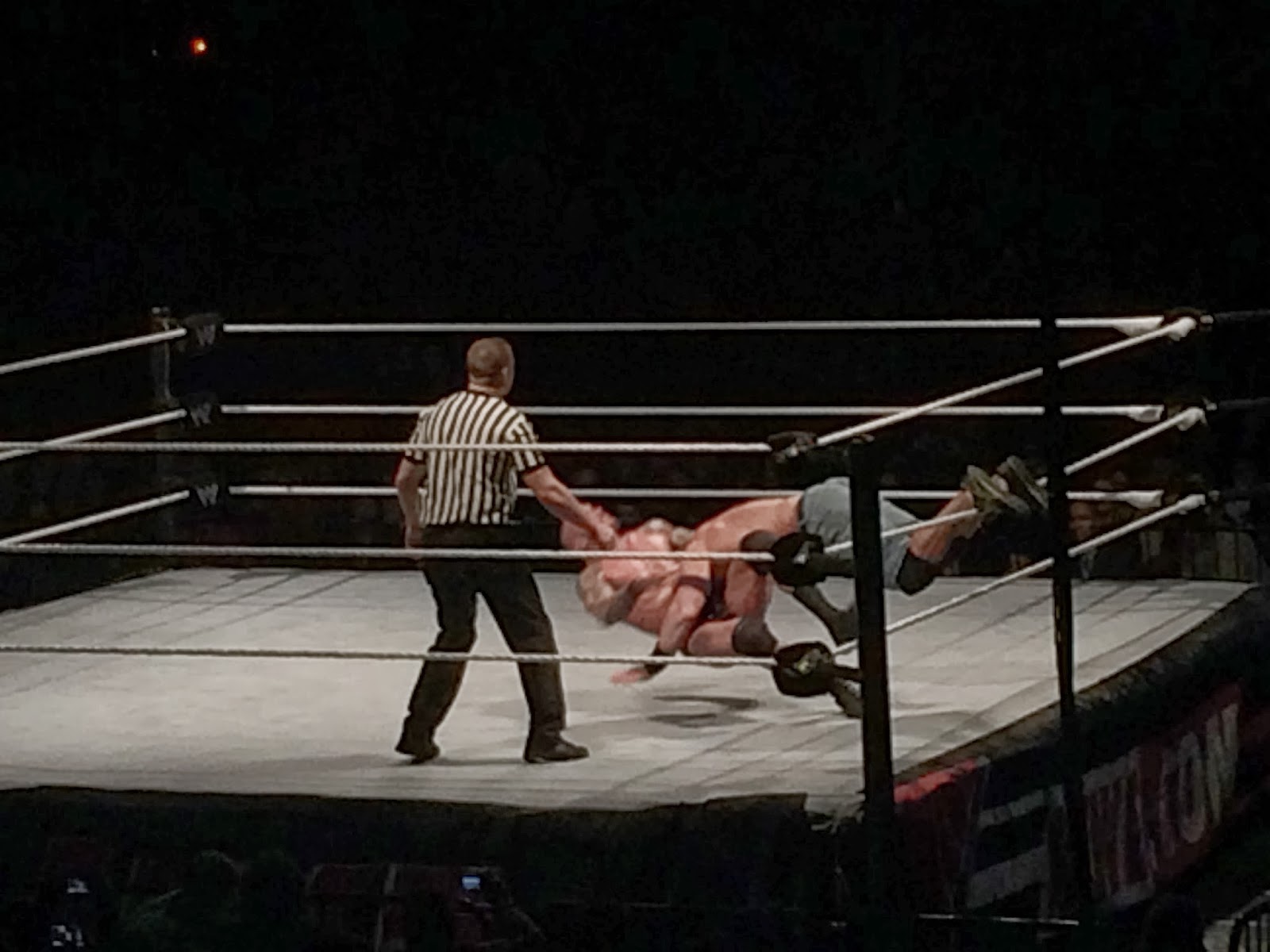 In this video from Meredith the referee was actually in a pretty good position for the count, but you can get a sense of the engagement level of the crowd. You will see Orton catch Cena in a thunderous powerslam and go for the cover, only for John to kick out at two and a half. It was really exciting, and you can hear the enthusiasm of the spectators: